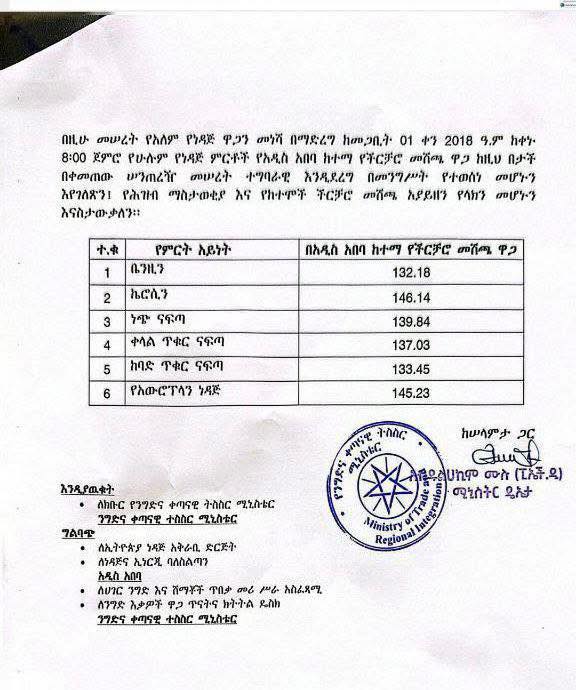 በዚህም መሠረት በዋና ዋና የነዳጅ ምርቶች ላይ የተቀመጠው የችርቻሮ መሸጫ ዋጋ የሚከተለውን ይመስላል፦